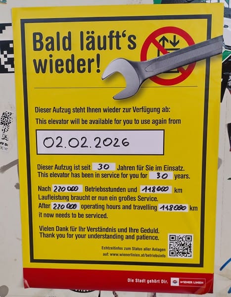 Zur Information aller U-Bahn Nutzer. Der Aufzug bei der Station U6 Perfektastraße unterzieht sich einer Wartung.