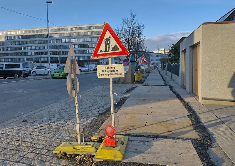Ausgehend von der Perfektastraße in Richtung Ketzergasse, so der Verlauf, wird der Fußgängerweg aufgegraben.